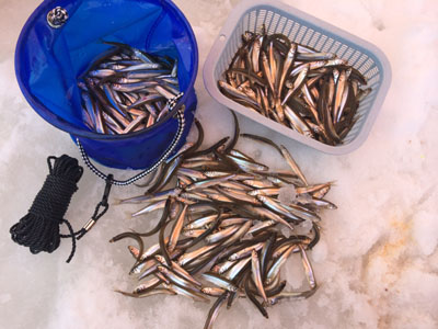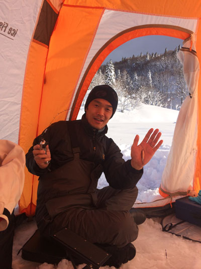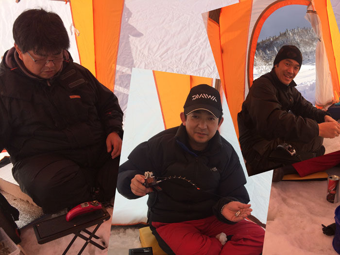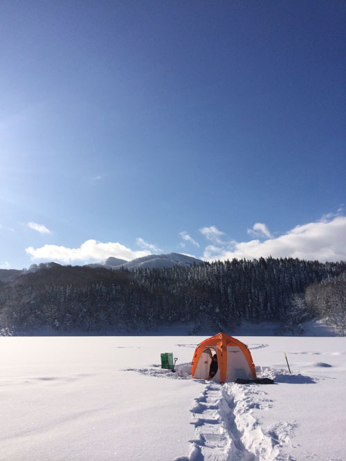 秋田のワカサギ様は裏切りません! 一年ぶりのなまった腕の私にも釣れてくれます! 朝7時頃から釣り初めて午後1時まで時折入れ喰いモードまじえながら良いペースで釣れます! 3者3様の仕掛けやエサでしたが釣果の差はあまり見られませんでした。 このポイントは沼の入口側(旧秋田いこいの村の裏付近)で水深は10m前後あります。 この日釣れた棚は3〜6m付近で浅い棚の魚の方が群れの数もやる気o(^o^)o