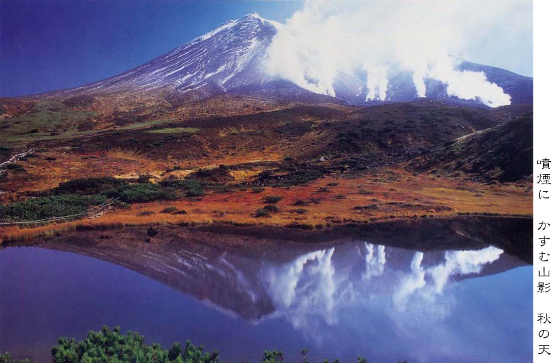 ◆秋の天 9月 大雪山二子池より旭岳 『噴煙に かすむ山影 秋の天』
