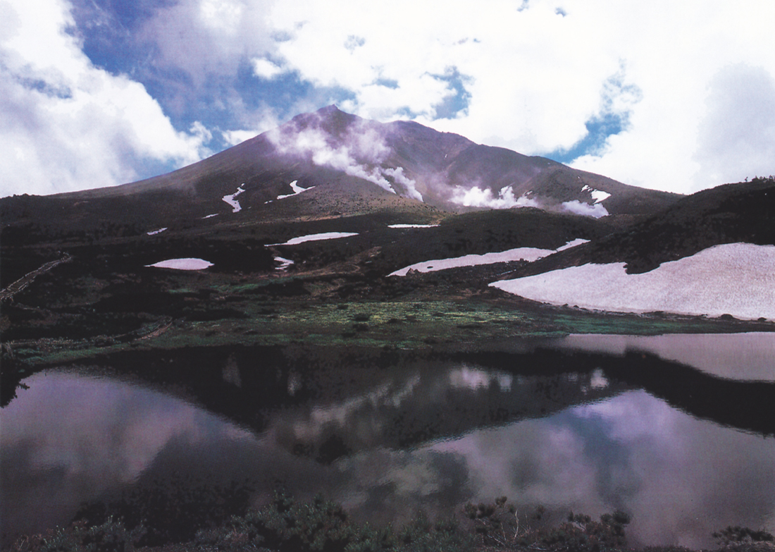 ”水ぬるむ” 二子池より 朝日岳 −7月− 『水ぬるみ 写る雄姿や 旭岳』